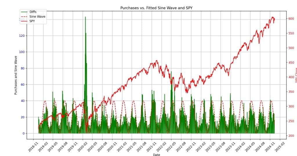 Basically, insider trading filings are highly cyclical due to earnings season. Insiders do not want to be seen trading too close to earnings, because then their purchases can get some extra scrutiny. You’ll see in this image, I curve fit a sine wave to the historical data.