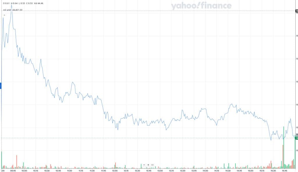 The next one, AVDL, was not. Over the course of the day, it consistently fell. It opened at 8.61, and only rose to 8.74 before falling the rest of the day. I actually lost big on this one today, but it happens. Nothing is risk free. (It is back green again now after hours, but very low volume.)